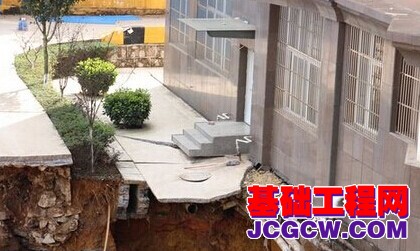 核心提示: 南城家园东面楼房前的小区道路断裂,碎成几段滑入基坑