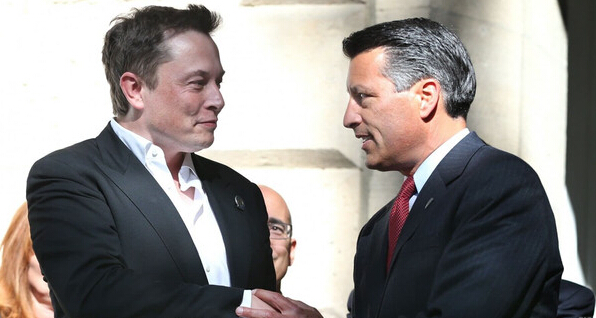 去年9月份,在内华达州首府卡森市召开的新闻发布会上,特斯拉汽车公司宣布将在内华达州建设一家投资规模为50亿美元的汽车电池千兆工厂,图为首席执行官埃伦?穆斯克(左)和内华达州长布莱恩?桑多瓦尔在会上握手庆贺。
