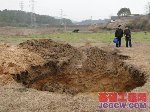 据了解,“天坑”出现在万载县康乐街道东升村南面一空旷稻草田中。现场地势平坦,坑洞在田段中央位置,洞口呈不规则圆形,直径约5米,四壁的断面齐整。坑洞内堆积了垮塌的泥土。