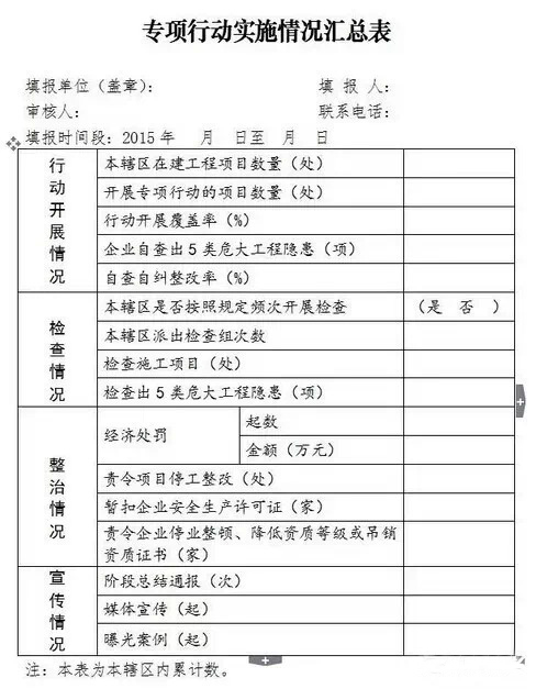 请各地住房城乡建设主管部门认真做好相关信息的汇总和报送工作,将专项行动实施方案于2015年4月30日前,专项行动实施情况汇总表(见附件)分别于7月1日和10月1日前,年度总结报告于12月15日前报送至我部工程质量安全监管司。