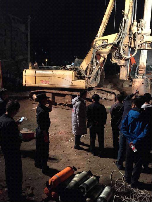 22日00:32,旋挖钻机开始工作。操作旋挖钻机的是建山公司的技术员王伦,保证钻机的垂直度就显得非常重要。一旦上面发生细微的偏差,30多米下去,误差可能就非常大,因此也会影响到孩子的安全。