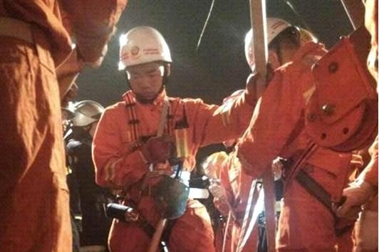 22日02:15,旋挖钻机打孔作业已完成,孔径1米,深35米,用时1小时43分钟。成孔偏差小于30cm。消防战士已下井展开营救。一名身材比较瘦小的消防员背着设备,下到井下,准备用电钻在井下对水井井壁进行破拆。