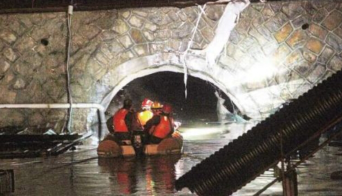 6月1日1时许 救援人员乘皮划艇进入隧道搜寻被困人员,在隧道内一辆水泥搅拌车上救出2名被困人员。