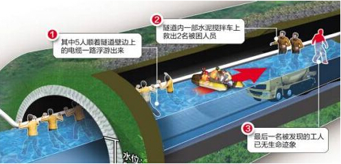 现场人员告诉记者,自行脱困的5名工人行动自如,并无大碍,而6月1日凌晨1时许被救出的2名工人在一旁休息后,情绪渐渐恢复平静,开始讲述他们的经历。其中一人说:“我们是互相打气,才能在淹水的隧道中支撑4个小时。”