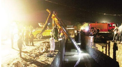 消防官兵赶到时,倒灌的山洪已将隧道口的三分之二淹没,隧道内的水位最深处已超过2米。由于洞内情况不明,水位较深,皮划艇无法进入洞内,消防官兵立即和现场的工人一起利用消防车的车载水泵抽排倒灌的洪水。