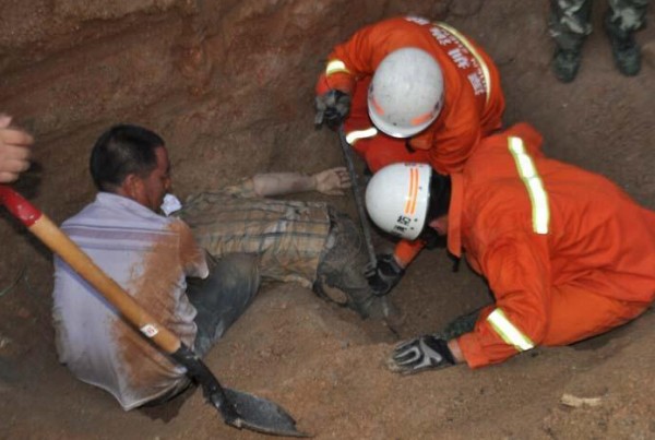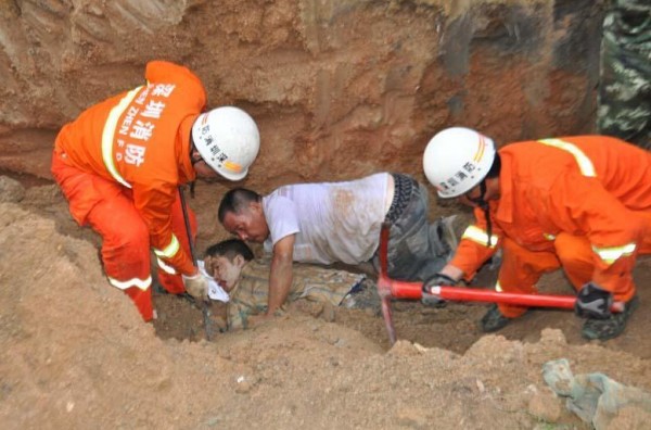 6月16日傍晚,深圳宝安石岩一工地塌方,一名工人在施工当中被塌方的泥土掩埋,深至数米,随时可能因此窒息。随后消防中队官兵徒手挖掘将被埋工人及时救起送医,工人才免于一难。 据宝安石岩中队消防员介绍,16日18时26分,该中队接到求救报警称,石岩园岭幼儿园后方一处正在施工的工地施工,有人被泥土掩埋。图为救援现场。