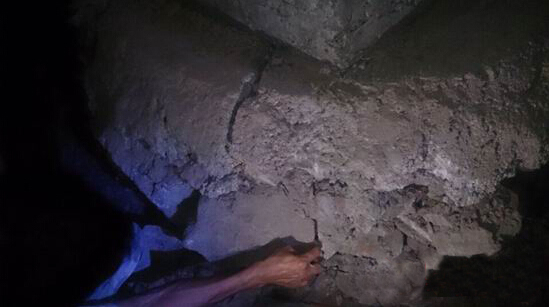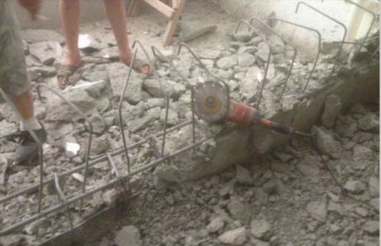 周先生说,居民怀疑墙体开裂的原因在于,这3栋楼下的商铺在装修施工过程中,存在严重违规现象。在周先生的带领下,记者来到小区商铺。记者注意到,1、2、3栋楼楼下的三层楼商铺门口堆放着大量的沙石。有些商铺在装修中,改变了原来商铺的设计,重新修建和搭建阳台和过道。周先生指着一处被砸碎的承重梁说,“你看嘛,这是居民楼主体工程的承重梁,他们也敢砸。”记者看到,承重梁和房梁被砸碎后,原本包裹在混凝土里面的钢筋已暴露在外面,一些房梁的钢筋已经被切断。