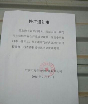 不少商铺门口粘贴着广安市万佳物业管理有限公司7月13日发布的《停工通知书》,内容上称:“接上级主管部门通知,因新天地一期门市在装修中存在严重违规现象,现责令所有门市一律停工,待上级部门解决处理后再进行装修,违者将报城管执法局依法处理。”