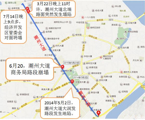 7月14日,潮州大道又地陷了!是的,“又”!这是潮州大道第几次地陷了?潮州大道是潮州市区的主干道,双向6车道的潮州大道是市区最宽阔的道路。为何潮州最好的道路连连地陷?这一两年里,潮州的路面发生了几次地陷?潮州地陷隐患在哪?