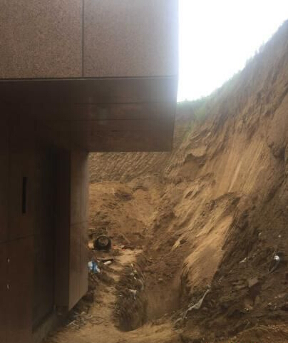 滑坡现场“哈南之星”9号楼旁一米处就是高约4米的土坡