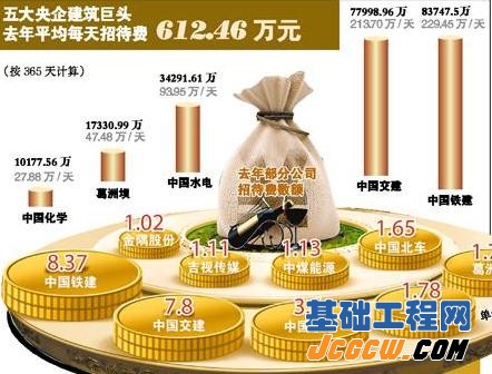 有意思的是,统计显示,央企公司的招待费用绝对值都很高,除了中国铁建外,还中国交建、中国水电、葛洲坝等去年的该项费用都数以亿计。而包括上 述四大巨头以及中国化学在内的公司均为建筑企业,去年一年合计招待费高达22.35亿元。这也就意味着,如果按照365天计算,上述五大央企建筑公司去年 平均每天吃喝送礼就扔出612万元。