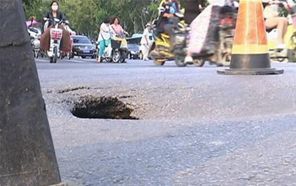 9月9日下午5点多钟,江苏徐州市和平路与黄河西路路口,路中间的快车道上突然发生塌陷,大约有近10平方米的路面整体塌陷下沉约40公分,其中塌陷最深的地方约2米多深。