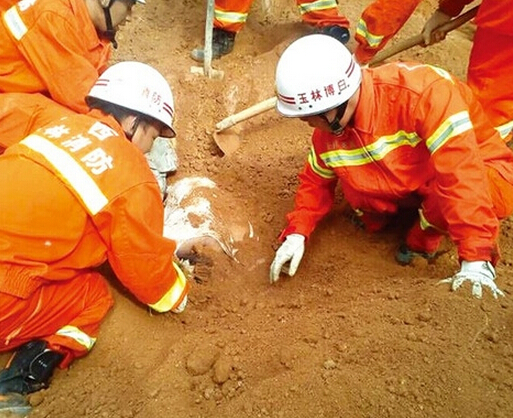 事发后,当地政府和居民迅速组织人员抢救被埋母女。一台钩机赶到现场,清理塌方的泥土。博白县消防大队官兵到场后,得知塌方的泥土约有600立方米,整个铁皮屋完全被掩埋,已经无法确认这对母女的被困位置。消防指战员立即调来另一辆钩机增援,并调派消防搜救犬搜救被埋母女,终于确定了这对母女的被埋点。