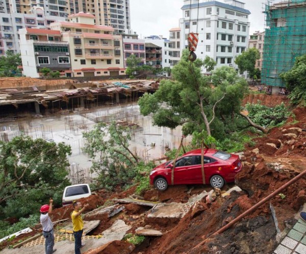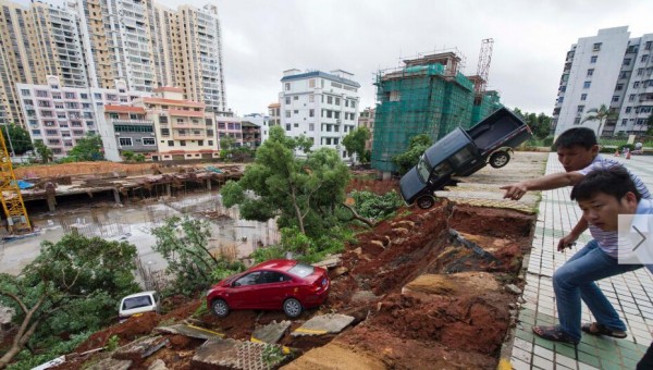 海南海口一停车场塌方 车辆落入深坑