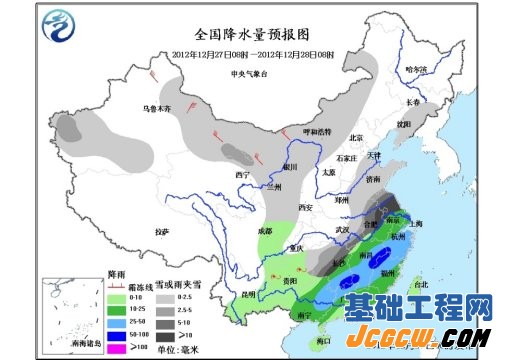 27日08时至28日08时,南疆西部、北疆东部、西北地区大部、黄淮大部、江汉东部、江淮、湖南中北部等地有小到中雪或雨夹雪,其中,湖南中部、湖北东部、苏皖北部部分地区有大雪,局地暴雪;贵州中部和西部局部地区有冻雨;江南南部、华南北部的部分地区有中到大雨,局地暴雨,局部地区伴有雷暴和冰雹等强对流天气;新疆北部、西北地区等地有5~6级偏北风。