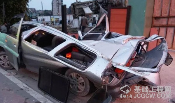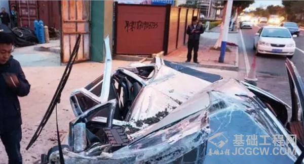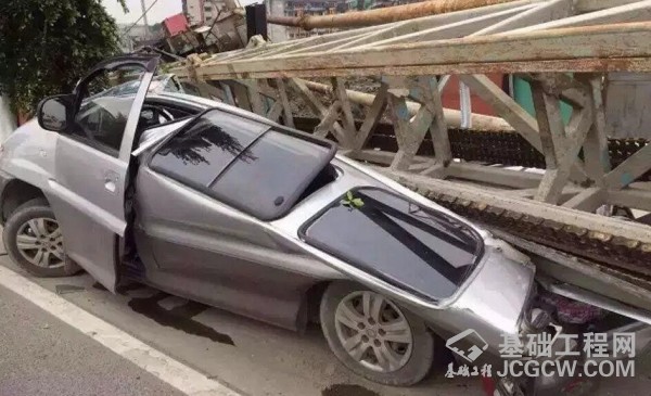 广东汕头:30米高打桩机压扁汽车 司机逃过一劫