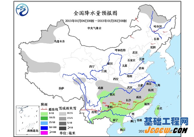 4日08时至5日08时,新疆西北部、黑龙江西北部、四川中北部、贵州北部、湖北中南部、江南中北部和西部等地有小雪或雨夹雪;云南南部、江南南部、华南西部和北部等地有小雨或阵雨,其中,贵州中部、湖南南部、江西西南部等地的部分地区有冻雨。内蒙古东部、东北等地有4~6级风。台湾海峡、南海东北部和中东部将有7~8级、阵风9级的东北风。 5日08时至6日08时,新疆北部、黑龙江北部和东部、湖北中南部、贵州北部、江南北部、江淮西部等地有小雪或雨夹雪;云南东南部、江南中南部、华南西部和北部等地有小雨或阵雨,其中,贵州中部等地的部分地区有冻雨。东北等地有4~6级偏北风。台湾海峡、南海东北部、中部和西南部将有6~8级风。 【气象科普:冻雨及其防御措施】 冻雨的形成原理 冻雨是初冬或冬末春初时节常见到的一种天气现象,是一种灾害性天气。 当较强的冷空气南下遇到暖湿气流时,冷空气像楔子一样插在暖空气的下方,近地层气温骤降到零度以下,湿润的暖空气被抬升,并成云致雨。当雨滴从空中落下来时,由于近地面的气温很低,在电线杆、树木、植被及道路表面都会冻结上一层晶莹透亮的薄冰,气象上把这种天气现象称为"冻雨"。我国南方一些地区把冻雨又叫做"下冰凌",北方地区称它为"地油子"。雨滴与地面或地物、飞机等物相碰而即刻冻结的雨称为冻雨。这种雨从天空落下时是低于0°C的过冷水滴,在碰到树枝、电线、枯草或其他地上物,就会在这些物体上冻结成外表光滑、晶莹透明的一层冰壳,有时边冻边淌,象一条条冰柱。这种冰层在气象学上又称为"雨凇"或冰凌。冻雨是过冷雨滴或毛毛雨落到温度在冰点以下的地面上,水滴在地面和物体上迅速冻结而成的透明或半透明冰层,这种冰层可形成"千崖冰玉里,万峰水晶中\'的壮美景象。如遇毛毛雨时,则出现粒凇,粒凇表面粗糙,粒状结构清晰可辨;如遇较大雨滴或降雨强度较大时,往往形成明冰凇,明冰凇表面光滑,透明密实,常在电线、树枝或舰船上一边流一边冻,形成长长的冰挂。冻雨多发生在冬季和早春时期。我国出现冻雨较多的地区是贵州省,其次是湖南省、江西省、湖北省、河南省、安徽省、江苏省及山东省、河北省、陕西省、甘肃省、辽宁省南部等地,其中山区比平原多,高山最多。雨水从空中落下来结成冰,这种冰积聚到一定程度时,不仅有害,而且危害不浅。 冻雨的危害 冻雨风光值得观赏,但它毕竟是一种灾害性天气,它所造成的危害是不可忽视的。电线结冰后,遇冷收缩,加上冻雨重量的影响,就会绷断。有时,成排的电线杆被拉倒,使电讯和输电中断。公路交通因地面结冰而受阻,交通事故也因此增多。大田结冰,会冻断返青的冬麦,或冻死早春播种的作物幼苗。另外,冻雨还能大面积地破坏幼林、冻伤果树等。冻雨厚度一般可达10~20毫米,最厚的有30~40毫米。冻雨发生时,风力往往较大,所以冻雨对交通运输,特别对通讯和输电线路影响更大。据气象专家分析,冻雨是在特定的天气背景下产生的降水现象。在此期间,江淮流域上空的西北气流和西南气流都很强,地面有冷空气侵入,1500至3000米上空又有暖气流北上,大气垂直结构呈上下冷、中间暖的状态,自上而下分别为冰晶层、暖层和冷层。即3000米以上高空大气温度往往在-10℃以下,2000米左右高空,大气温度一般为0℃左右,而2000米以下温度又低于0℃。冻雨大多出现在1月上旬至2月上、中旬的一个多月内,起始日期具有北早南迟,山区早、平原迟的特点,结束日则相反。地势较高的山区,冻雨开始早,结束晚,冻雨期略长。如皖南黄山光明顶,冻雨一般在11月上旬初开始,次年4月上旬结束,长达5个月之久。据统计,江淮流域的冻雨天气,沿淮淮北2~3年一遇,淮河以南7~8年一遇。但在山区,山谷和山顶差异较大,山区的部分谷地几乎没有冻雨,而山势较高处几乎年年都有冻雨发生。冻雨是一种灾害性天气,它大量冻结积累后能压断电线和电话线,严重的冻雨会把房子压坍,飞机在有过冷水滴的云层中飞行时,机翼、螺旋桨会积水,影响飞机空气动力性能造成失事。 冻雨的预防 所以,当冻雨发生时,要及时把电线、电杆、铁塔上的积冰敲刮干净;在机场,要及时清理跑道和飞机上的积冰。对于公路上的积冰,及时撒盐溶冰,并组织人力清扫路面。如果发生事故,应当在事发现场设置明显标志。在冻雨天气里,人们应尽量减少外出,如果外出,要采取防寒保暖和防滑措施,行人要注意远离或避让机动车和非机动车辆。司机朋友在冻雨天气里要减速慢行,不要超车、加速、急转弯或者紧急制动,应及时安装轮胎防滑链。