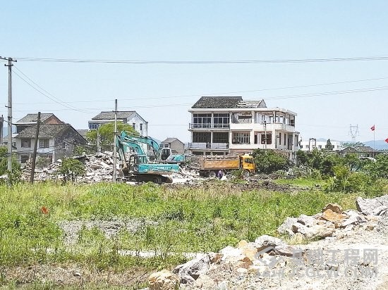 12日,记者来到黄岩江口街道的洋头村附近,这里的工地上部分土地已经得到平整,平整过的工地上插着许多红色的小旗子,表示这里将成为施工区域。在旗子标识的边上,几幢民房正在被拆除,挖掘机将已经拆倒的房子的废材掏到工程车上。附近其他的房子,墙上都喷上了红红的“拆”字。