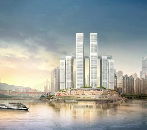 它整合了陆地和水运的各种公共交通设施,设置了地下高架桥、轻轨站、公交中转站、港务码头和游客中心。项目设计源于重庆积淀千年的航运文化,分别以350米及250米的高度化形为江面上强劲的风帆。象征重庆“梯坎”面貌的水晶廊桥长达300米,将4栋塔楼彼此连接,在60层楼、250米的高空中集合了酒店、购物、休闲中心等舒适宽敞的公共空间,在夜晚犹如一条璀璨的琉璃锦带立于朝天水域。