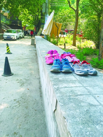 9日下午,记者来到西坝河西里小区,反映比较集中的是5号楼、7号楼及9号楼。来到这些楼前,首先映入眼帘的就是楼前这片蛛网般的绿地。绿植上有很多晾衣绳,被单、衣物挂得到处都是,其中也包括居民们提到的背心、大裤衩。绿地四周的石台子上,则成了晒鞋的地方。