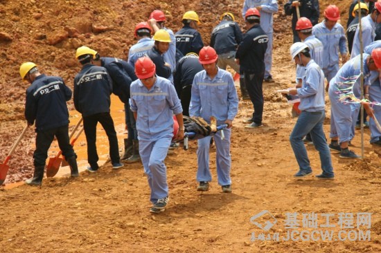 根据基坑防坍塌应急预案,各应急救援职能小组立即赶赴事故现场,分工开展救援活动,警戒组设置警戒隔离危险区,疏散人员,在救援过程中时刻观察边坡险情;抢险救援小组持铁锹、担架、医药箱赶赴现场进行救援;物资保障组清除路障,引导120急救车赶赴事故现场进行施救。演练过程中各应急小组协同作战,反应迅速,科学施救,仅用不到10分钟时间即完成了救援工作,整个演练过程规范、迅速、有序、安全。