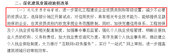 2017年2月24日,国务院办公厅下发《关于促进建筑业持续健康发展的意见》(国办发〔2017〕19号),将“优化资质资格管理”作为首要事项,放在文件“深化建筑业简政放权改革”的第一条,足见重视程度。