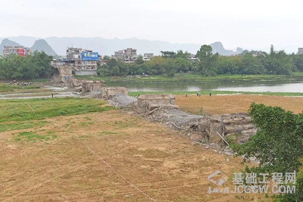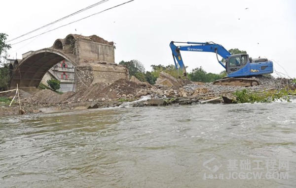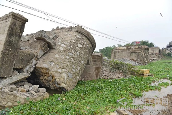 合水大桥旧桥1978年建成通车,桥梁全长251.6米,桥面宽7.12米,跨径组合为7×30米,桥梁上部结构为空腹式双曲拱桥,下部结构为重力式桥墩,U型桥台。设计荷载为汽车15吨、挂车80吨。经相关部门检测评定为四类危桥,由于该桥病害发展加剧,于今年3月26日封闭禁止所有车辆及行人由此桥通行,计划对该桥进行拆除重建。合水大桥旧桥拆除专项施工方案经今年3月29日召开专家评审会并通过,于4月15日开始进行拆除。