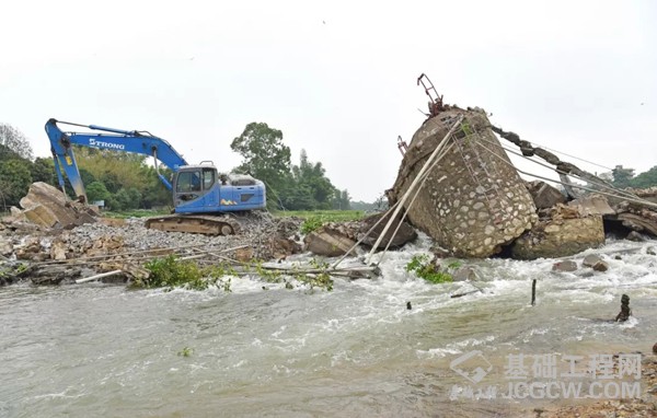 核心提示: 4月25日上午9时,阳春市合水大桥旧桥在拆除重建过程中,施工人员在使用挖掘机挖除大桥西往东方向第二跨桥面铺装时突然发生意