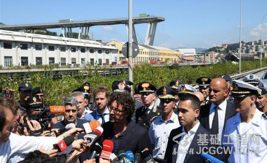 8月15日,在意大利北部热那亚地区,意大利副总理迪马约(前右)和基础设施与交通部长达尼洛·托尼内利(前左)在事故现场接受记者采访。 意大利政府15日宣布,发生在14日的莫兰迪公路桥垮塌事故致死人数已升至39人,另有9人伤势严重。