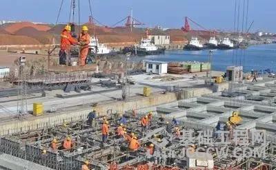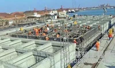 地槽式干船坞是在岸边海平面以下的槽型沉箱预制设施,坞室长120m、宽30m、高1m,坞底位于水下16多m深处。坞室靠海侧设有电动升降式坞门,作用是在坞室内沉箱预制过程中隔离海水。沉箱预制完毕后,坞门打开,坞室注水,浮起沉箱,便于沉箱运出坞室。坞室内可同时预制多个沉箱。坞室外的地平面上,沿坞室左右两侧设有4台有轨运行塔吊,主要用于吊卸大型钢质模板和成捆钢筋。坞面还配有混凝土浇注灌车和轮胎吊车。