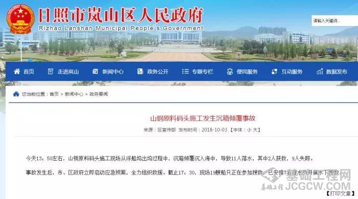 核心提示: 2018年10月3日13:50左右,山钢原料码头施工现场从浮船坞出坞过程中,沉箱倾覆沉入海中,导致11人落水,其中2人获救,9人失踪