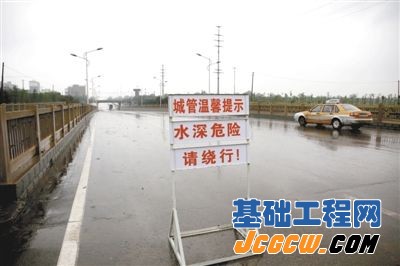 昨日,记者没有找到桥附近的水泵点,但在即将进入地道桥的路面上,有一辆车前盖披着“城市防汛”条幅的车辆停在路边,车前一个白底红字的牌子上写着“城管温馨提示 水深危险请绕行”,牌子和字迹都显得很新,而前方的地道桥下并没有积水。
