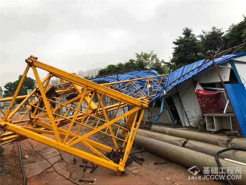 现场二十多米高的工地塔吊倒在一个大坑旁边,塔吊顶端还砸瘪一处工棚,幸运的是,当时工棚里并没有人。