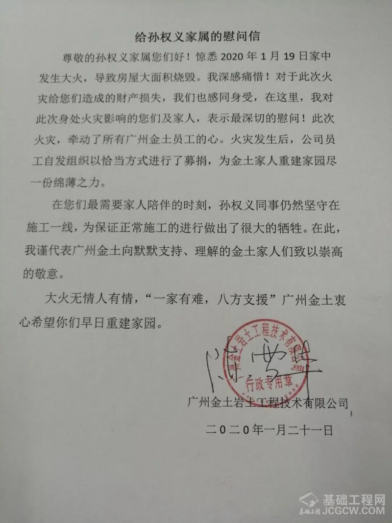 广州金土董事长陈雪华获悉此事后,第一时间致电该员工,送上了最深切的慰问,并捐赠5000元为金土家人重建家园尽一份绵薄之力,同时为该员工家属亲笔书写慰问信一封。
