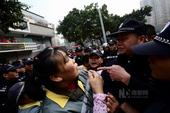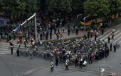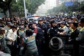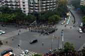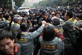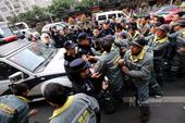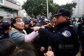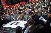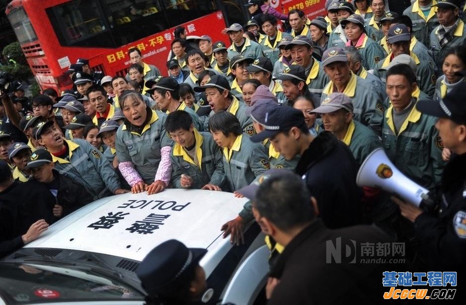 1月10日,广州荔湾区中山七路与荔湾路路口有200多名环卫工聚集要求涨薪。一名身有酒味的市民为环卫工出头说话,后被警方带走调查,环卫工涌上街头与警方对话。尽管工人停工,但该区的卫生状况保持良好。图为一名情绪激动、带有酒气的普通民众在激动喊话后被警方带上警车,激起了环卫工人包围警车。