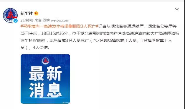 另新华社记者从湖北省交通运输厅、湖北省公安厅等部门获悉,现场造成3名人员死亡(含2名现场掉落施工人员、1名掉落货车上人员)、4人受伤。
