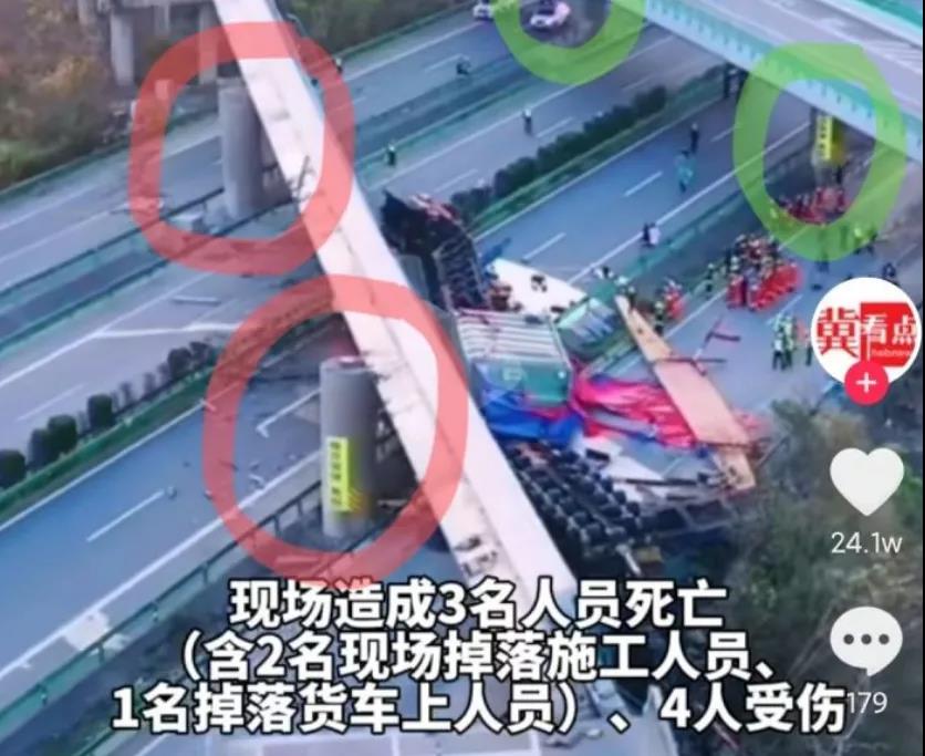 针对网上关于施工、超载导致事故的一些说法,其表示,事发时桥梁没有施工,但匝道桥是独柱墩桥,事发时有三辆货车同向行驶,其中一辆是大件运输,重量为190吨,有关情况正在进一步核实中。