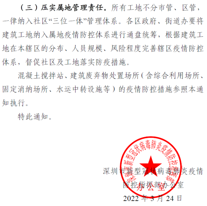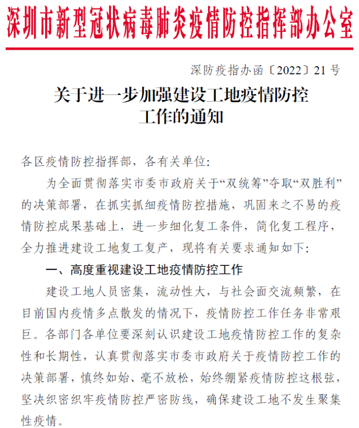 深圳市《关于进一步加强建设工地疫情防控工作的通知》(深防疫指办函〔2022〕21号)明确以下几点: