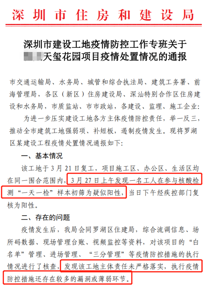 核心提示:深圳一工地出现阳性病例,且疫情防控措施还存在较多的漏洞,工地被责令立即全面停工。暂停施工、监理单位一年内在深圳参加招投标、承接工程项目的资格。