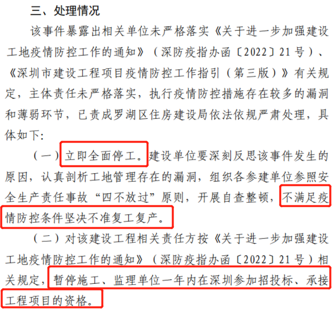 ◆对该建设工程相关责任方按(深防疫指办函〔2022〕21号)相关规定,暂停施工、监理单位一年内在深圳参加招投标、承接工程项目的资格。