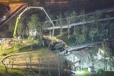 在塌陷位置附近看到,还有重型机器正在加紧浇灌水泥。