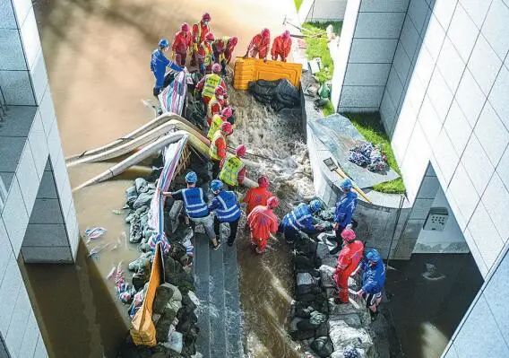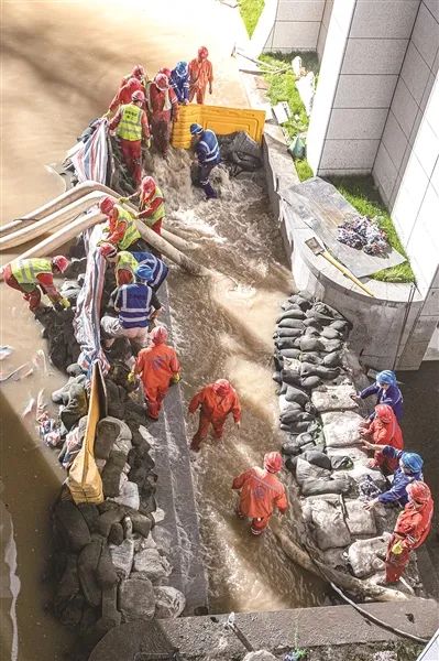 20:15,应急抢修人员展开管涌封堵和积水外排工作。