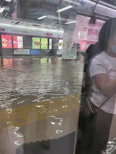 金沙湖公园下沉广场出现管涌 湖水外溢致使金沙湖地铁站形成涝水。