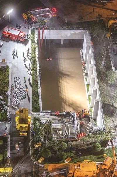 昨晚,金沙湖公园下沉广场,应急抢修人员进行管涌封堵和积水外排工作。