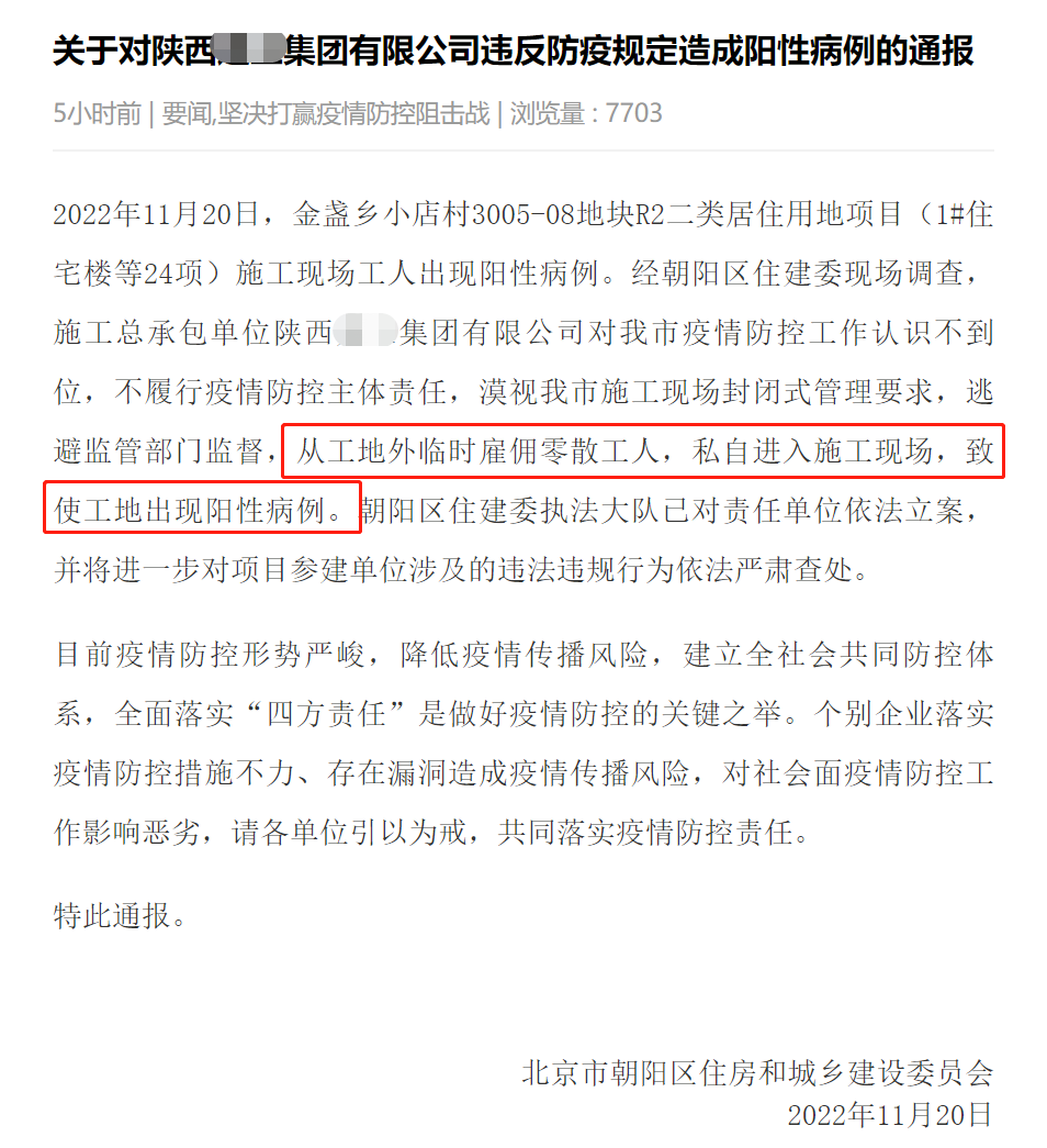 日前,北京市朝阳区住建委发布了关于《关于对陕西XX集团有限公司违反防疫规定造成阳性病例的通报》。