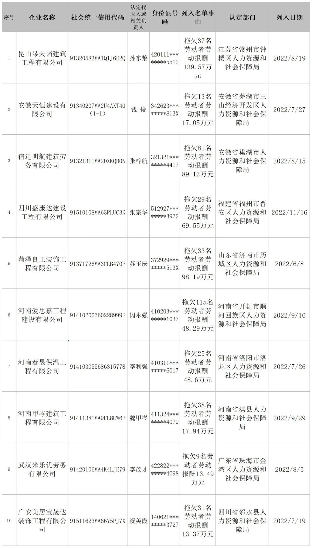 近日,人力资源社会保障部公布一批拖欠农民工工资失信联合惩戒对象名单,共包括10家企业,都与建设领域相关,具体如下: