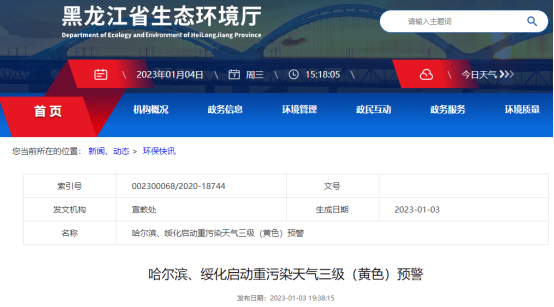 1月3日14时、15时,哈尔滨市、绥化市分别启动重污染天气三级(黄色)预警。重污染天气期间: