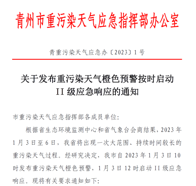 1月3日10时,青州市发布重污染天气橙色预警,1月3日12时,启动Ⅱ级响应措施。应急响应措施如下: