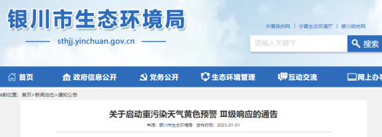 按照自治区“提前一天,提高一级”要求,银川市重污染天气应急指挥部决定于1月1日20时启动银川市重污染天气黄色预警(Ⅲ级)响应。现将有关事项通告如下。