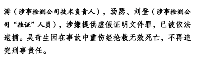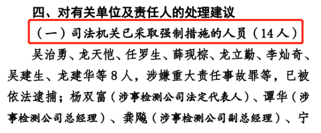 涉事房主吴治勇、湖南湘大工程检测有限公司法定代表人杨双富、金山桥街道金坪社区盘树湾组居民龙立勤等14人涉嫌重大责任事故罪、提供虚假证明文件罪、寻衅滋事罪,被公安机关立案侦查、检察机关提起公诉。